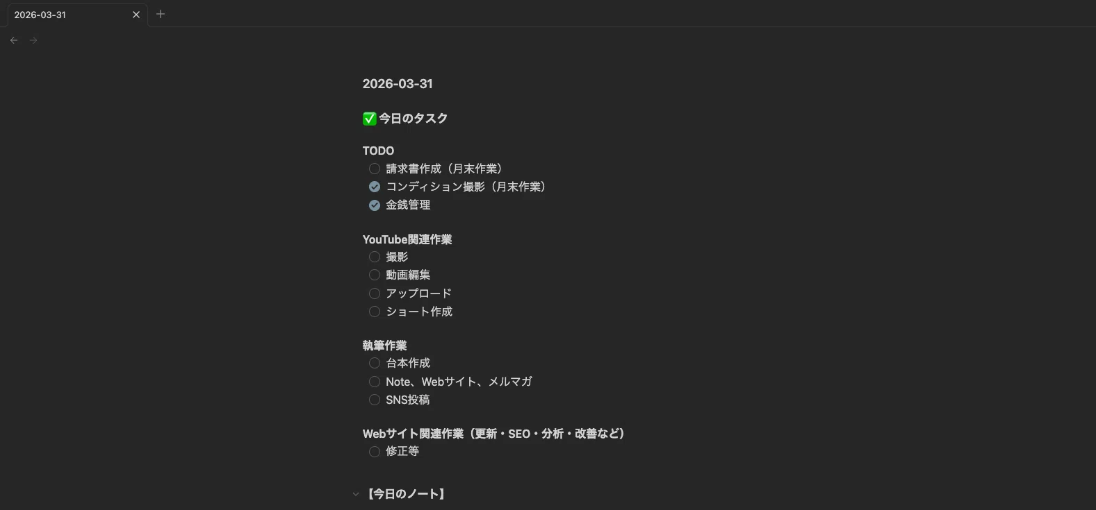 内容は、今日やることや毎日やるようなタスク、日記のような一言の項目が生成されるように設定。TODOアプリなどは使用せずに日毎にざっくりと管理している。