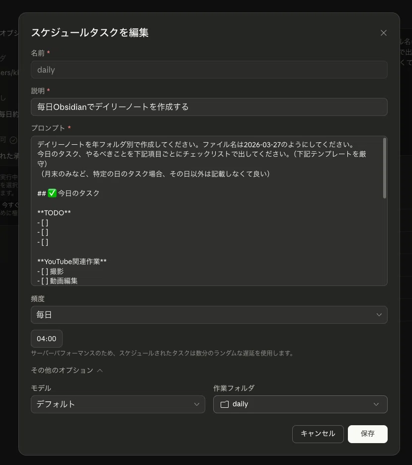 Obsidianには標準でデイリーノートを作成できるが、Claude Coworkから自動で生成してもらうようにしている。