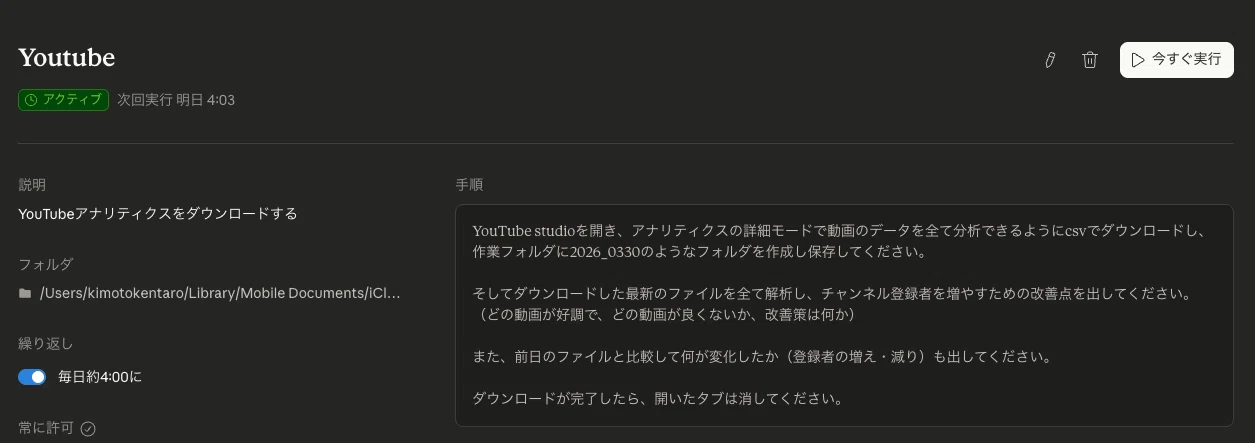 Coworkのタスク機能で決まった時間にスケジュールできるから、それを利用している。